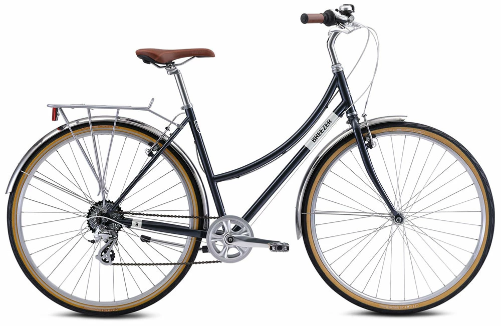 The Downtown is Breezer’s classic chromoly steel town bike: 700C wheels, equipped with matching fenders and chainguard, rear rack, kickstand, and bell.