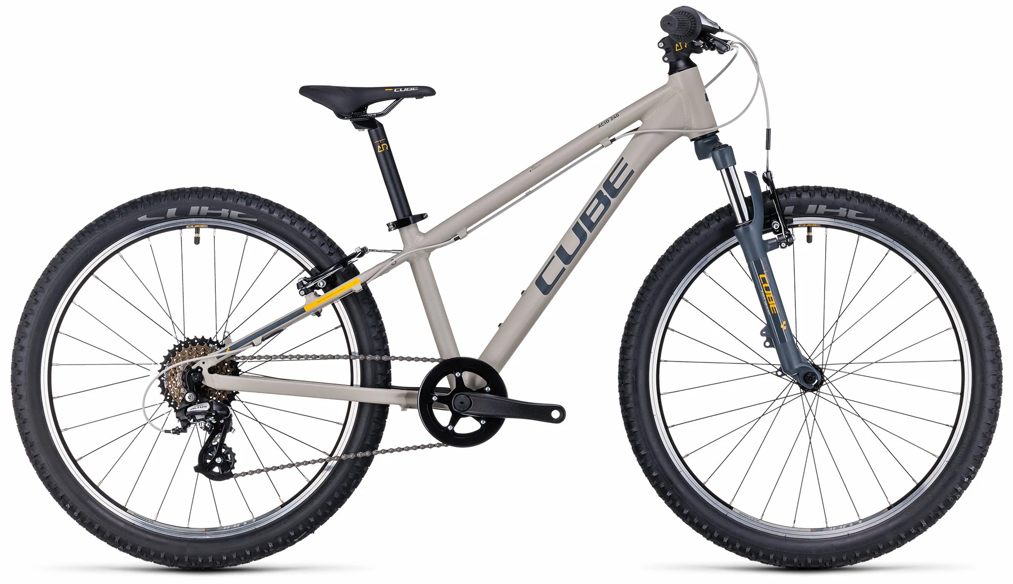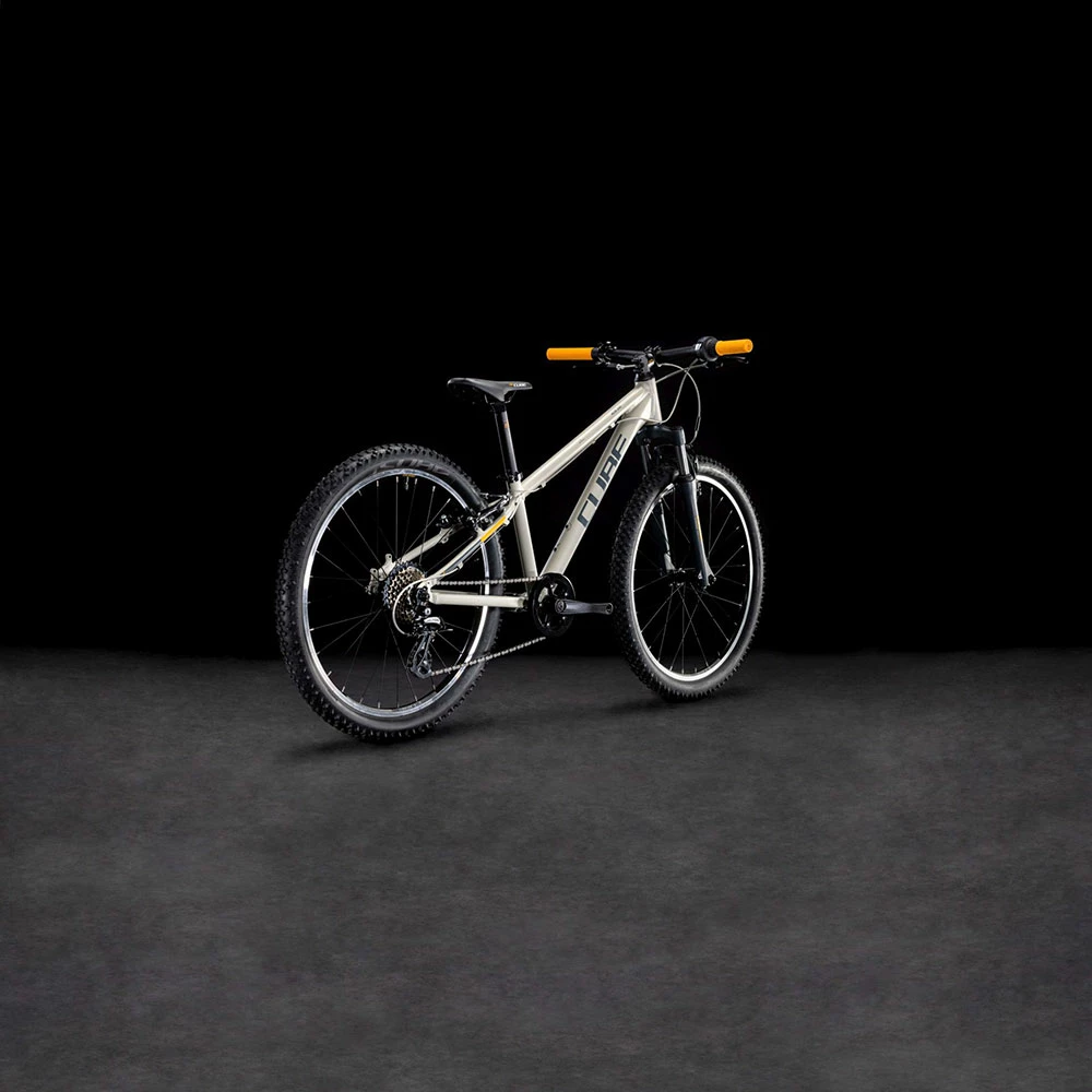 Built from the same heat-treated 6061 aluminium tubes as the adult bikes, the Acid 240’s frame is every bit as tough as a full-size mountain bike, but with the right weight and proportions for a child. There’s a bottle mount for mid-ride refreshment and rack mounts, too. The handling is designed to be both fun and confidence-inspiring. And, because CUBE knows accidents can happen, they made the gear hanger easily replaceable so that a knock or crash needn’t result in an expensive repair.