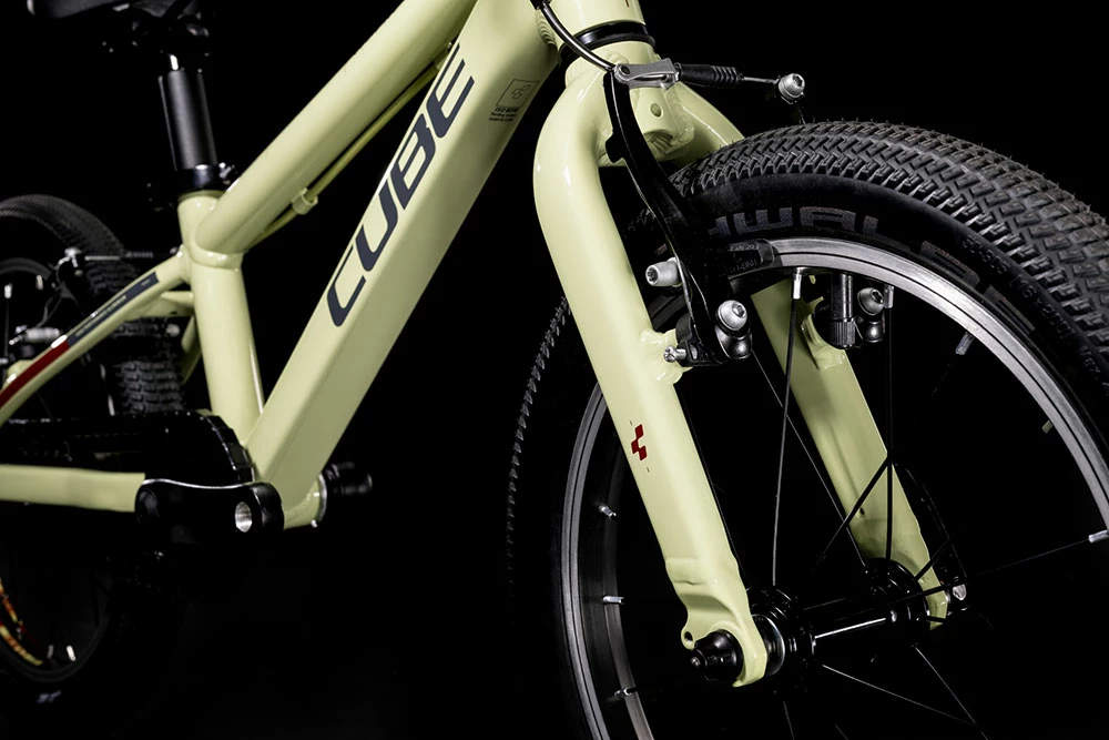 The Cubie 160 is designed to be fun and responsive, but with the safety of stable, predictable steering. The lightweight aluminium 6061 frame features rounded edges and corners to help minimise the risk of injury, but CUBE has ensured that it’s more than tough enough to stand up to enthusiastic use. The lightweight alloy fork helps keep the overall weight down and contributes to the bike’s lively but safe handling. And, of course, there’s a choice of paint finishes to capture every child’s imagination.