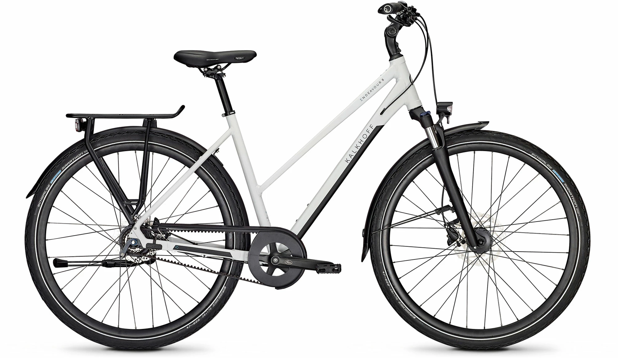 This is bike touring. Wherever your next tour is going to take you, the Kalkhoff Endeavour 8 is ready. The 8-speed hub gears, hydraulic disc brakes and belt drive system make it the ideal choice for anyone who is looking for adventure on a low-maintenance but high-quality trekking bike. Other strong features that make for a trouble-free tour include the practical pannier rack and wide studded tires.