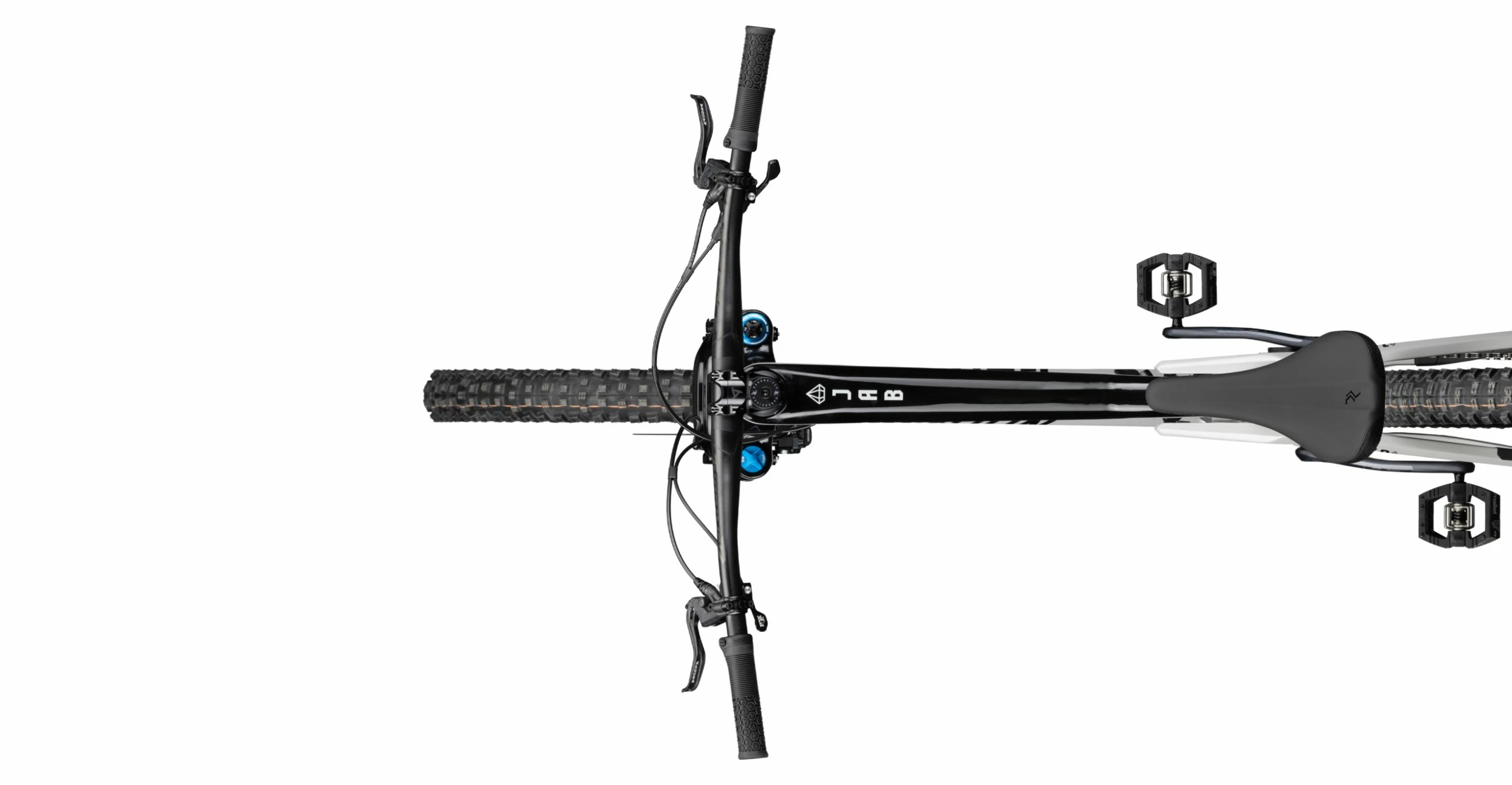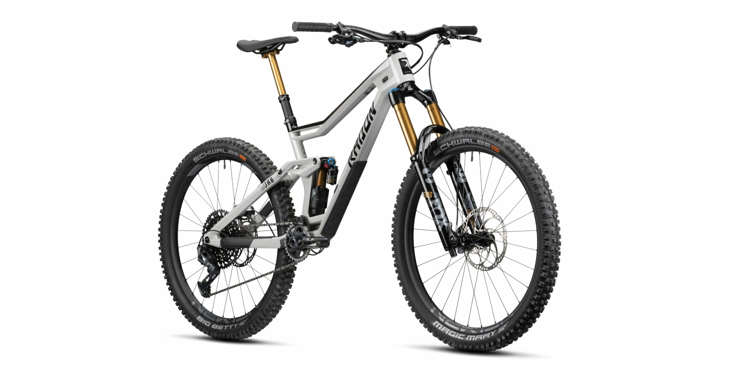 When it comes to the equipment, we’re going all out and giving the bike only the finest parts. For the suspension, we rely on the Fox Factory series with noble and low-friction Kashima coating for the best response. The job at the front is done by the Fox 38 Factory fork with FIT GRIP2 cartridge – both compression and rebound can be adjusted separately in high- and low-speed to your needs in order to get the maximum performance out of it. The Fox Float X2 Factory does its job brilliantly at the rear and can be activated for long climbs via a 2-position lever in the platform to completely eliminate the already minimal bouncing. The noble 1×12 SRAM GX Eagle groupset is complemented by an even nobler SRAM X01 rear derailleur, crisp gear changes and a huge range characterise this group and ensure the right gear ratio in every situation. We make no compromises when it comes to the wheelset: the Newmen Evolution SL A.30 impresses with its low weight and high stability, even at the limits, and with its 30mm inner rim width accommodates the Schwalbe Magic Mary tire combination on the front and Big Betty on the rear – both in the Addix-Soft rubber compound and Super Trail casing for tough use. Our Enduro luxury liner is rounded off by the Fox Transfer Factory, of course also in Kashima finish, as well as a chic Race Face Turbine R cockpit. Are you ready for the JAB 10.0 HD?