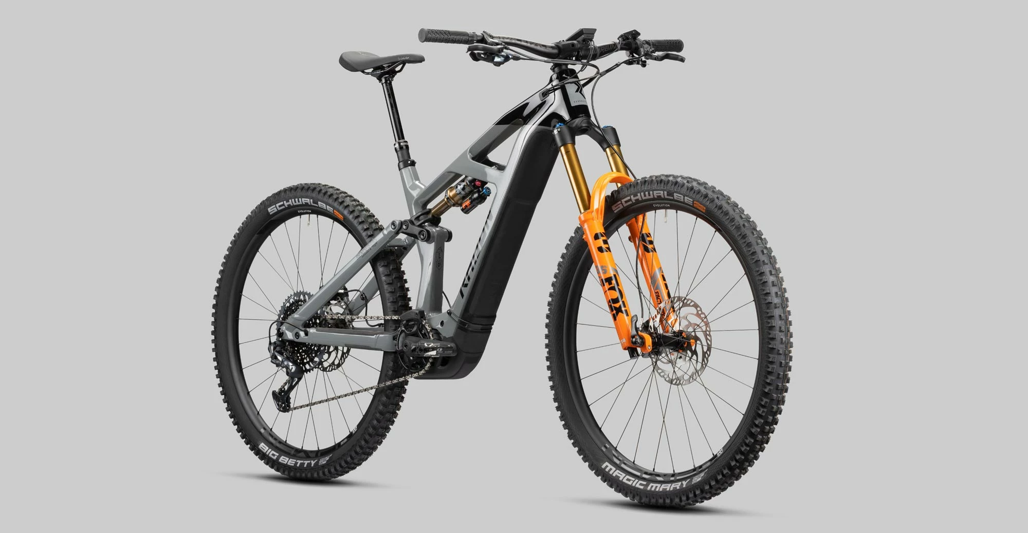 New to the RENDER 750 frame is the ability to accommodate the large 750 Wh battery for the Bosch Smart System, the speed sensor integrated into the dropout and the mounting option for a display in the top tube. At the heart of the RENDER 10.0 750 is the Bosch Performance CX motor with its powerful 85Nm of torque and 340% maximum pedaling assistance, which provide you with sufficient power in any situation. Thanks to the 750 Wh battery capacity of the Powertube 750 you can extend your trail adventures even further into the surrounding countryside, depending on the choice of support level really long ranges are feasible. In addition to the choice of motor modes, you can help with this choice of the right gear ratio to let the motor work efficiently. For this purpose, we mount a SRAM X01 Eagle12-speed groupset on the RENDER, which provides an enormous range with its 10-52 tooth cassette, which allows you to climb any steep climb. The SRAM-typical crisp gear changes fit perfectly to the character of the bike. This is also characterized by the top chassis from the house of Fox, which responds silky smooth, but also in technical challenges and steep steps is full in the suspension travel and supports you confidently. At the front, the Fox 36 Float Factory 3Position springs and dampens and releases 160mm of travel, it is perfectly complemented at the rear by the brand new Fox Float X air shock, which generates 140mm travel. Full control over the trail you have with the ergonomic, short-wide RaceFace Turbine R cockpit, on which the strong four-piston stoppers Magura MT5 are also mounted, which let you brake at any time spirited and dosed. For technically demanding steep descents, the solid and proven SDG Tellis Dropper support can be steplessly lowered from the handlebars to give you the greatest possible freedom of movement, the Bel Air V3 saddle mounted on it from the same company provides comfort for epic laps. So that the power can also be brought to the ground, we mount a wheel-tire combination of the top class: the Newmen Evolution SL E.G.30 wheelset is equally light as solid and stiff and easily absorbs the forces of the drive. On it we mount high-grip and puncture-proof tires from Schwalbe, the combo of Magic Mary and Big Betty, each in the soft variant. RENDER 10.0 750 – what more do you need?