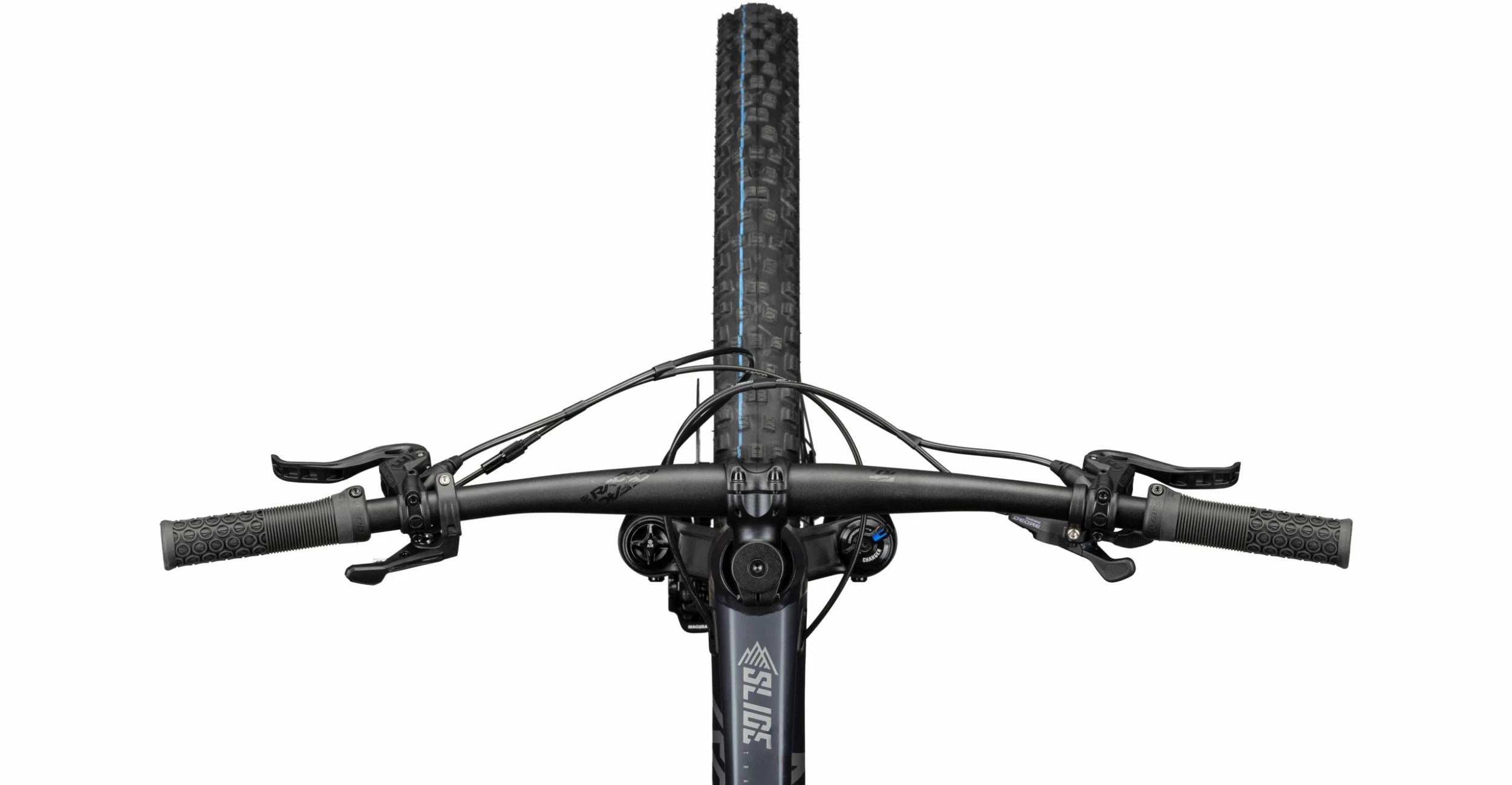 The RockShox Lyrik Select fork with 150mm travel responds very sensitively and still gives you optimum safety on steep passages and steps. With the 140mm travel of the RockShox Deluxe Select+ shock, every root can be smoothed out and the trail fun can begin! A clear line runs through the cockpit consisting of handlebar and stem from the Race Face Ride series. This allows you to build up great pressure on the front wheel and control is in your hands. The Magura MT Thirty Custom brake with its four-piston front decelerates quickly in tricky situations when needed. The 12-speed Shimano drivetrain gives you maximum speed. The bike is completed by the Nobby Nic all-round tyre with ADDIX Speedgrip rubber compound and Superground casing from Schwalbe. Paired with the solid SUNringlé Düroc 35 wheelset, you can tackle any obstacle with ease. Ready, Steady, Go – the SLIDE TRAIL AL 7.0!