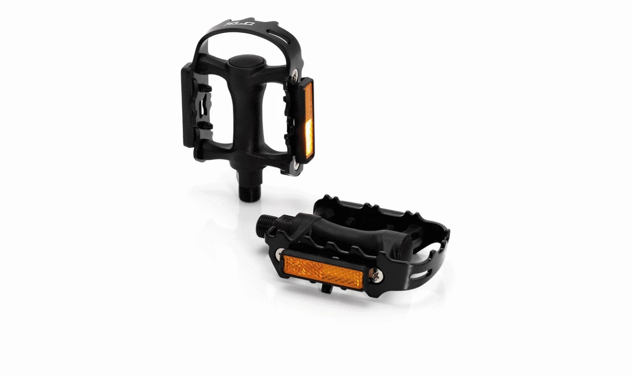 Pédales VTT avec corps en plastique, cadre en aluminium et roulements à billes.